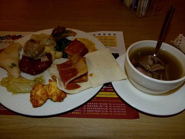 圖:第二盤是中式料理,有蜜汁火腿、糖醋排骨、蜜薯、咖哩蟹、時蔬、抄手等,還有台南的現涮牛肉湯。扒飛的餐點水準一定要遠於自助餐,而這裡的餐點確實不差,有過年加菜的水準。