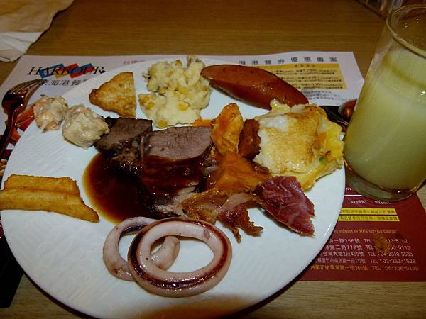 圖:接著是西式料理,有現切牛排、德式熱狗、炸物、小卷、芋泥拉沙等,再來一杯現榨芭樂汁。夾這麼一盤,頗有到美式啤酒屋用餐的架式,而漢來真的有供應生啤酒,只是我沒有倒。