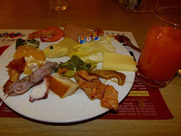 圖:別以為這樣就能打發我,繼續奮戰。這一盤是冷盤,有沙魚煙、小卷、章魚、各種起士、火腿、沙拉等,外加一杯綜合蔬果汁。雖然是比較清爽的菜色,但感覺依然很豪華。