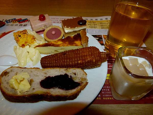 圖:最後的甜點有手工麵包佐手工果醬、烤蛋糕、布丁、奶酪和各式蛋糕或慕思,再加一杯水果醋。漢來的蛋糕真的很優,不像他君X、新XX的甜點像麵包送過來的。
