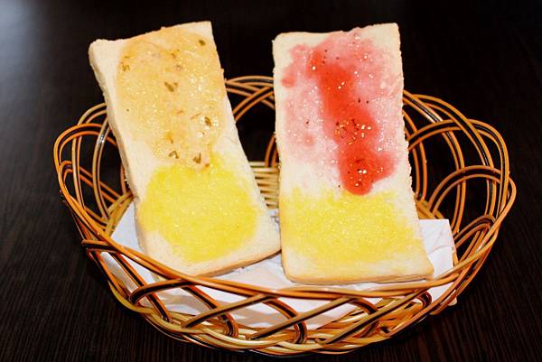 圖:當然還有其他的東西。開始用餐,首先先來兩片土司,塗上奶油、大蒜醬和草莓果醬,放在烤土司機,開胃小點就熱騰騰的完成了。